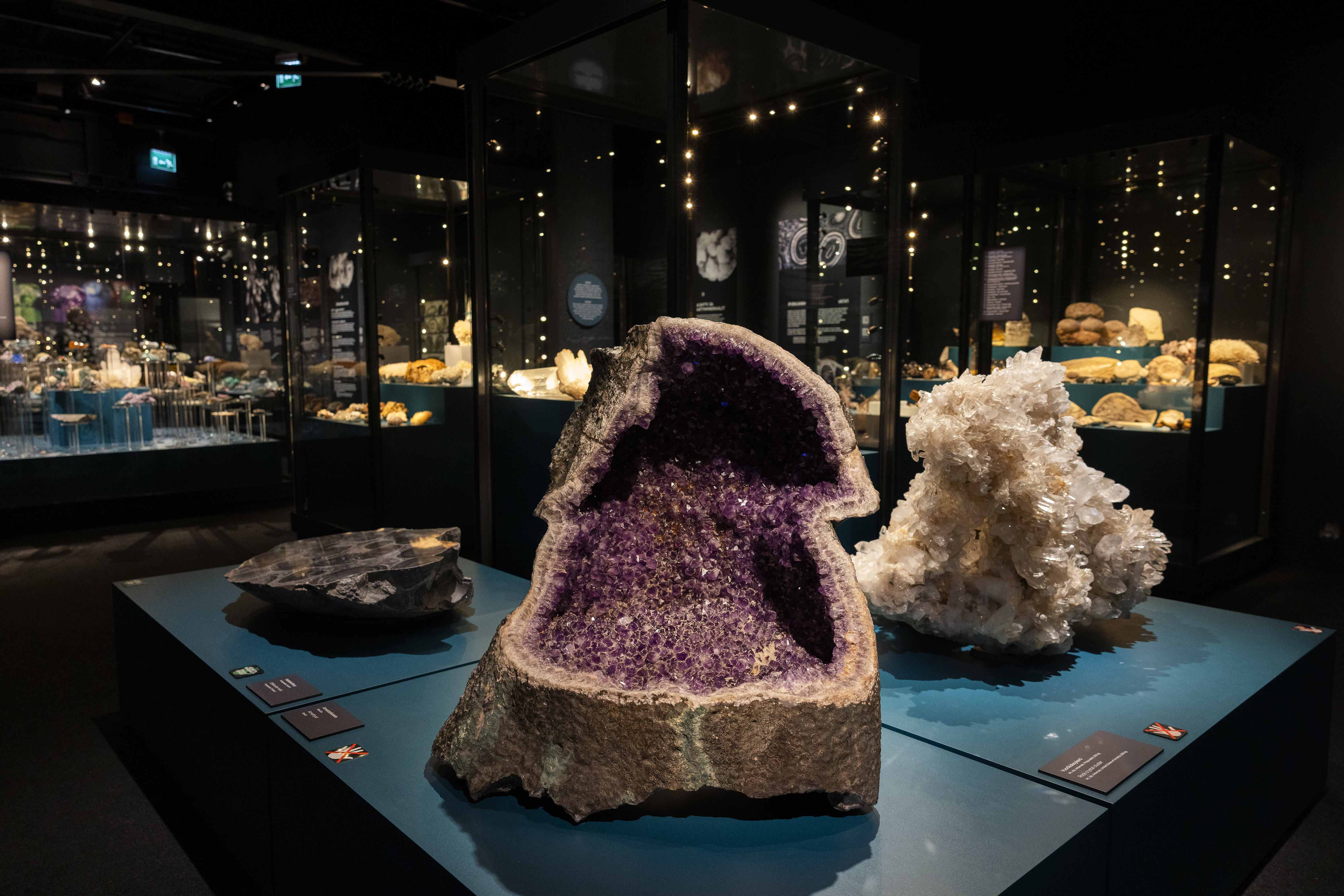 Galleria-tila toimii Kivimuseon väistötilana kesään 2026 saakka. Se ei ole suuren suuri, ja näyttelykokonaisuuden hahmottaakin mukavasti jo ovelta. Kivet on ryhmitelty tilan keskelle ja huoneen reunoille. Keskiössä on näyttävä Kivet akvaariossa -installaatio, joka esittelee yli 60 kivilajia. Kohdevalot nostavat kivet loistamaan kiehtovasti omissa sävyissään tilan tummaa yleisilmettä vasten. Näkymä on kutsuva – mitä kaikkea täältä löytyykään?